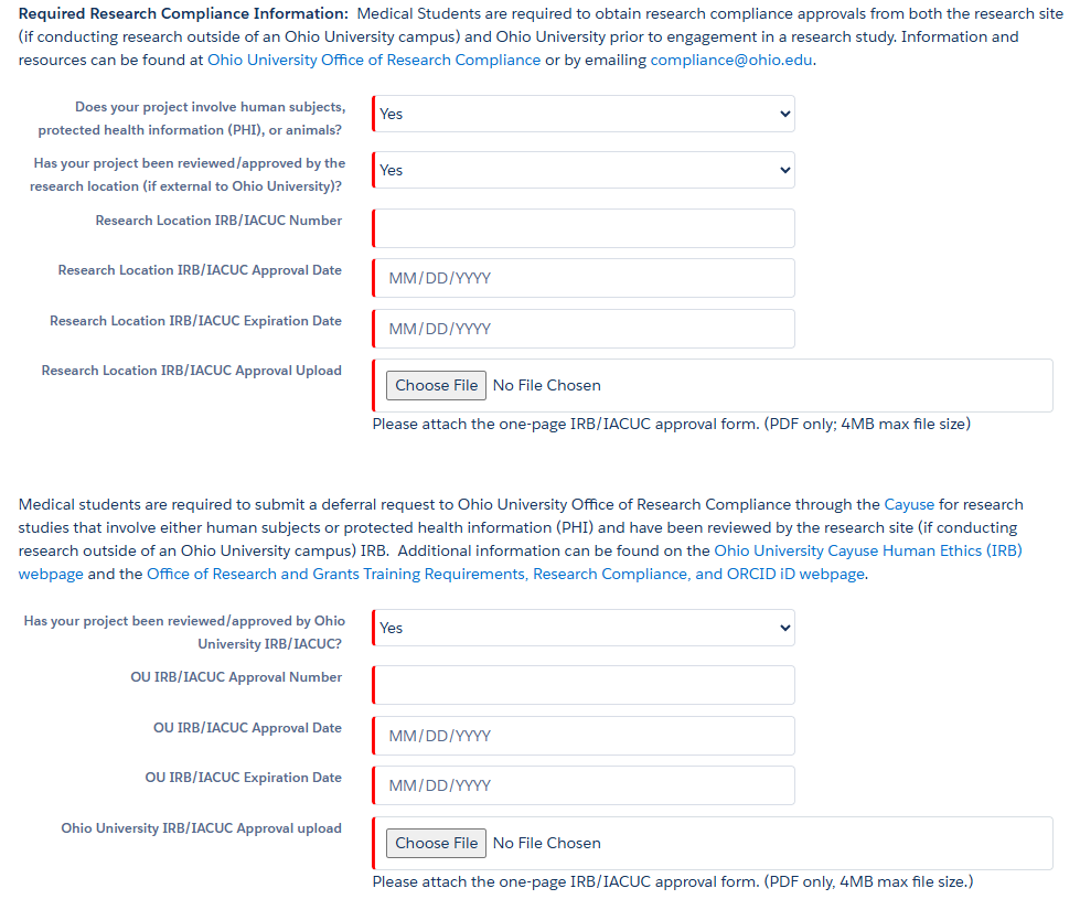 If your project or activity involves human subjects, protected health information, or animal subjects, you must have proper research compliance approval documentation and deferral documentation (if project is done outside of Ohio University), and these documents must be uploaded to your research or scholarly activity record. The option to upload the documents will only appear when you’ve selected “Yes” to the question about human or animal subjects. If you have questions about the research compliance process, please reach out to traineeresearch@ohio.edu or compliance@ohio.edu .