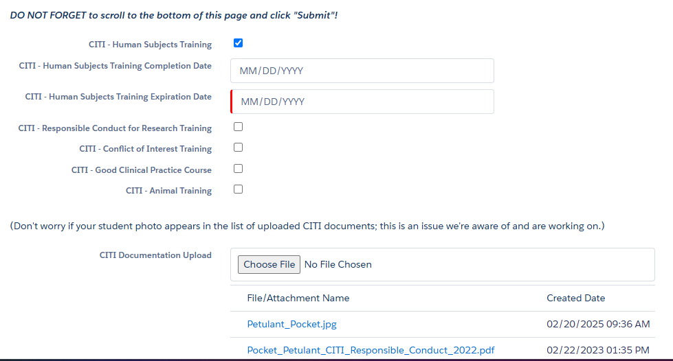 - CITI training completion records should be uploaded to the Student Documents in the Student Portal.
