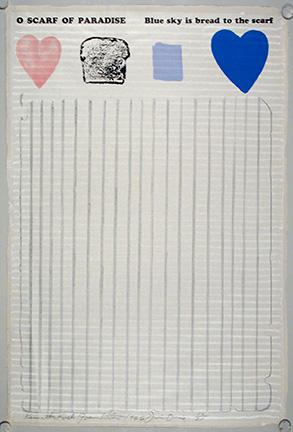 “Kenneth Koch Poem Letter” is a prime example of Dine’s simple style that is both whimsical and deeply emotional. Known for depicting common symbols and everyday objects, in this piece, Dine includes a pink heart, a piece of toast, a sky-blue color swatch, and a blue heart. The inscription above the four images reads, “O SCARF OF PARADISE/ Blue sky is bread to the scarf.” Here, “paradise” is coupled with the mundanity of “blue sky” and “bread,” conveying delight in domesticity.