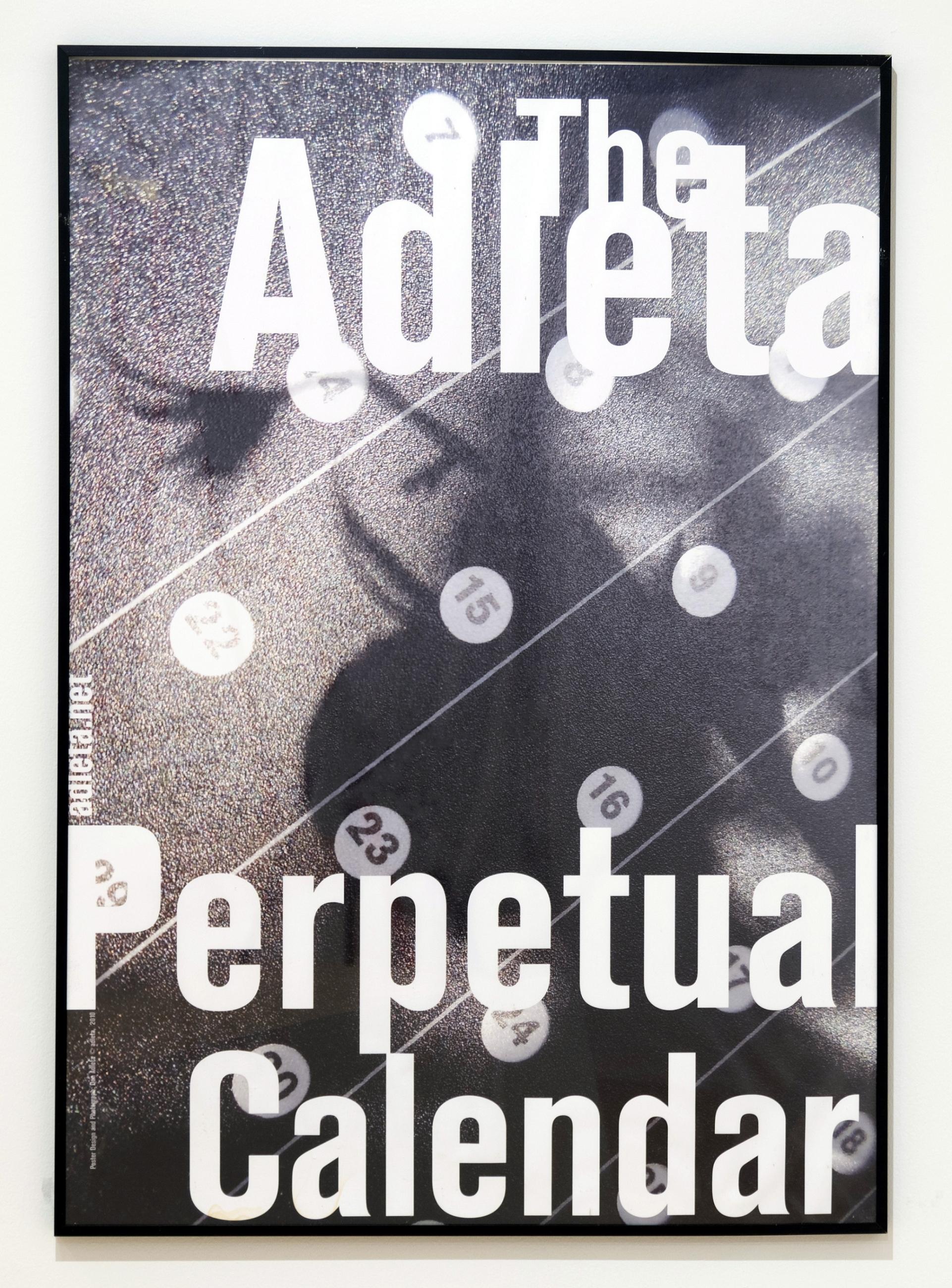 A promotional poster designed for the Adleta Perpetual Calendar which was originally made in 1981, produced in 1995, and sold out in 1996 at the Museum of Modern Art, NY.