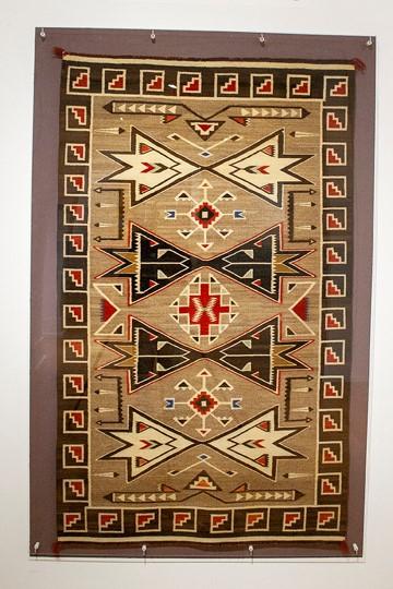 Shimá/Henry: Feathers are used to communicate with the super-beings. Everyone has a feather—a spiritual connection that grounds who we are as an individual. The rug is a living, spiritual being. The more symmetry it has, the more whole you are going to be as a person. Usually the four mountains are mentioned in our stories, but there are really six mountains and they all are found in this weaving. The whole rug is the Universe. The center is the Earth—the Earth also has to have alignment and symmetry as balance. The borders are the cosmos, including the clouds and the stars.