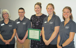 Photo courtesy of: Classified SenateClassified Senate members present Leanna Ater with August award (L-R): Nancy Vandeman, Adam Grimm, Leanna Ater, Heather Gould, Dana Wright