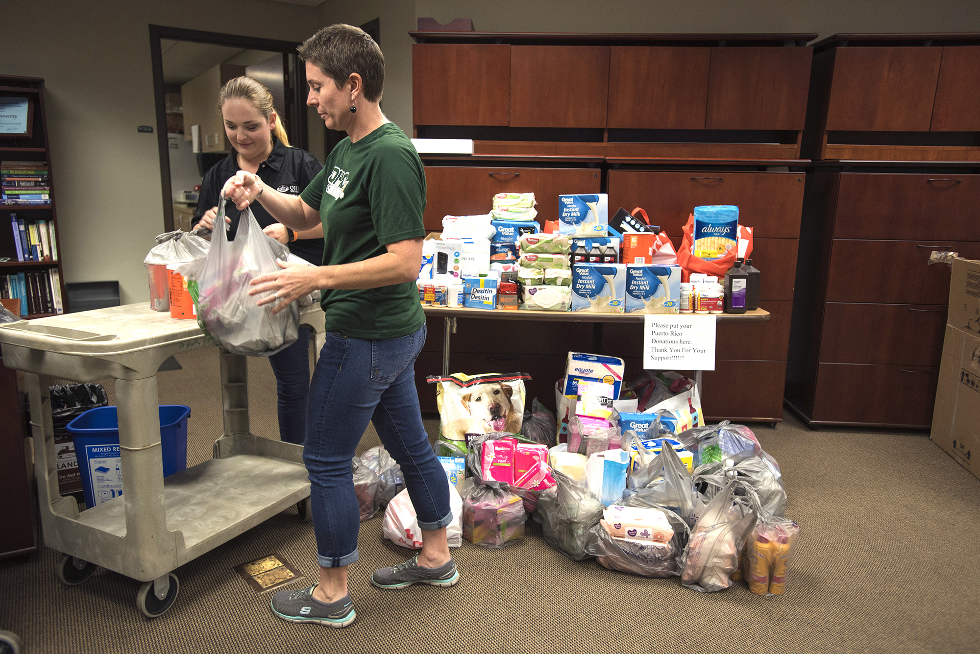 undefinedDonations for Puerto Rico hurricane victims were collected in the office of the College of Health Sciences and Professions’ Department of Social and Public Health (SPH). Department chair Tania Basta and SPH administrative specialist Lindsay Radomski loaded carts to transport the donations from the SPH office to Ohio University’s Airport. Lauren Dickey, College of Health Sciences and Professions