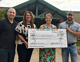 Ohio University Combat Veterans Club officeholders Julio "Caesar" Vega (far left) and Zach Wood (far right) present a check to Heather Skinner (center, left) and Diane Stock (center, right).