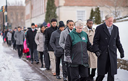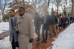 Photographer: Ben SiegelMembers of Alpha Phi Alpha Fraternity walk arm-in-arm during their Silent March on Jan. 15