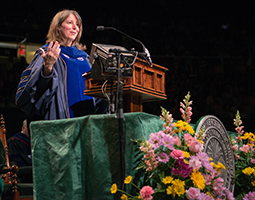 Photographer: Ben SiegelDr. Risa Whitson, an associate professor of geography and in the Women's, Gender, and Sexuality Studies Program and the 2016 Outstanding Graduate Faculty Award recipient, delivers the keynote address at the spring 2017 Graduate Commencement ceremony.