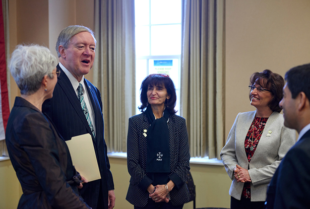 (From left) Vice Provost for Global Affairs and International Studies Lorna Jean Edmonds and Ohio University President M. Duane Nellis welcome three of the five-member delegation from Pontifical Catholic University of Ecuador to the Athens Campus. Members of the PUCE delegation pictured are Dr. Marleen Haboud, a linguistics professor and researcher; Dr. Graciela Monesterolo Lencioni, provost; and Rector Dr. Fernando Ponce Léon. Members of the delegation not pictured are Dr. César Eduardo Carrión, dean of the College of Communication, Linguistics and Literature, and Dr. Francisco Pérez Pazmiño, dean of the College of Medicine. Photo by Evan Leonard