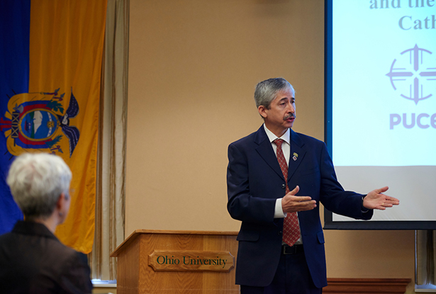 Speaking on behalf of his colleagues and university, Dr. Ponce thanked members of the OHIO community for the opportunity to visit the Athens Campus. “For us, this meeting is not only an honor but also a great opportunity for the mutual enrichment and strengthening of our relationship – one that grows as our institutions get to know each other better and share their ideals and realities,” Dr. Ponce said. Dr. Ponce gave a presentation on PUCE, Ecuador’s first private university, which was founded in 1946. He shared with the group both PUCE’s priorities, summing those up with one his institution’s favorite sayings – “To be more in order to serve better” – as well as its challenges. “We are sure that Ohio University can help us be faithful to our identity and mission, and we offer our help to Ohio University to achieve the same,” Dr. Ponce said.