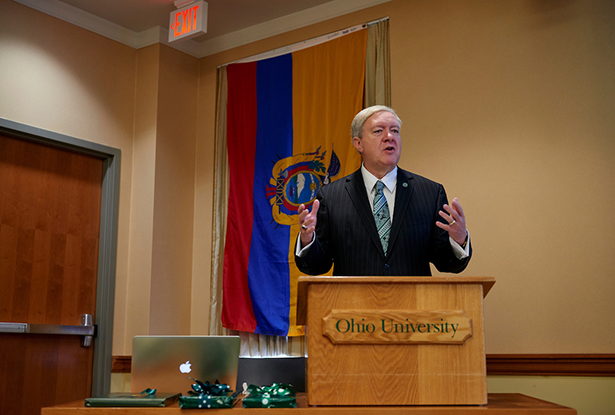 Ohio University President M. Duane Nellis delivers opening remarks at the welcome reception for the PUCE delegation, saying, “Your visit is one of the highlights of our year.” Photo by Evan Leonard