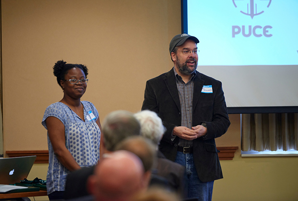 Neketa Forde, one of two students who produced a promotional video for the Ohio University Infectious and Tropical Disease Institute (ITDI), and Eric Williams, associate professor in the School of Media Arts and Studies and director of OHIO’s new MFA program, introduce the promotional video that highlights ITDI’s work in Ecuador. Photo by Evan Leonard