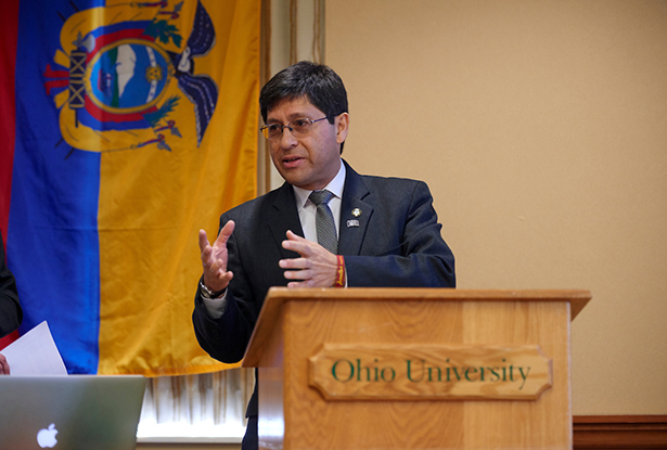 Dr. Mario Grijalva, a professor of biomedical sciences at the Heritage College of Osteopathic Medicine, director of OHIO’s Infectious and Tropical Disease Institute and director of the Center for Research of Health in Latin America, addresses those attending the PUCE welcome reception.