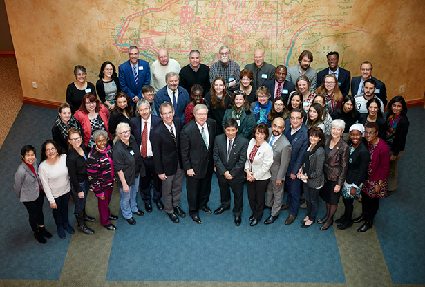 Dr. Grijalva noted that while formal relations between OHIO and PUCE began in 2000, they date back to 1989 when the founding members of what was then known as Ohio University’s Geographic and Tropical Disease Institute traveled to PUCE as their very first activity. “It is their work,” he said, “that allows us to be here.” Photo by Evan Leonard Since 1999, more than 600 OHIO students have participated in study abroad and research programs in Ecuador, and more than 40 Ecuadorians now count themselves among the global network of Bobcat alumni. Over the past nearly 20 years, the OHIO-PUCE partnership has extended beyond the Heritage College to include the Center for International Studies, the College of Arts and Sciences, the College of Health Sciences and Professions, and the Scripps College of Communication. Representatives from all of those academic units and more were on hand April 4 during a special International Week welcome reception for the PUCE delegation. “This is a very special week at Ohio University and in Athens because we are just thrilled to have our friends from Ecuador here to celebrate International Week with us,” Lorna Jean Edmonds, OHIO’s vice provost for global affairs and international studies, said in welcoming everyone to the reception. Dr. Edmonds was joined by Athens Mayor Steve Patterson, who told the delegation that the city of Athens was open to them, and by Ohio University President M. Duane Nellis. In addressing the group, Dr. Nellis thanked Dr. Grijalva and his colleagues both at OHIO and at PUCE whose work and interdisciplinary collaboration, he said, has been “truly transformative.” “I think many of the key questions that we face in our world today and certainly in our United States as well as our local region are very interdisciplinary,” Dr. Nellis said. “It’s those interdisciplinary interfaces where we have the greatest opportunities for meaningful solutions.”