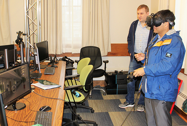 PUCE Rector Dr. Fernando Ponce Léon tries out some of the virtual and augmented reality equipment at Ohio University’s Game Research and Immersive Design (GRID) Lab as John Bowditch, director and co-founder of the GRID Lab, looks on. Photo courtesy of the Office of Global Affairs