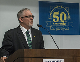 Photographer: Jorge Castillo CastroDean Scott Titsworth speaks at the Scripps College of Communication's 50th Anniversary Celebration in Schoonover Center on Monday, April 9.