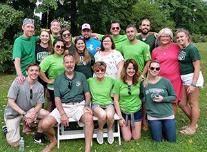 Members of Tyler Weymouth’s Bobcat family gather for a photo with his family and friends back home during this past summer’s fourth annual TyAthlon, a cornhole tournament that raises money for the nonprofit Tyler Weymouth Memorial Foundation. Photo courtesy of Andrew Logan