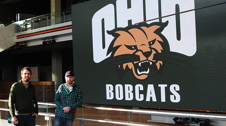 Fellow Bobcats Andrew Logan (left) and Tyler Weymouth pose in front of the Newseum’s “big screen,” proudly displaying OHIO’s Attack Cat. Logan, BSC ’10, and Weymouth, BSS ’11, worked together at the Washington, D.C. museum. Photo courtesy of Andrew Logan