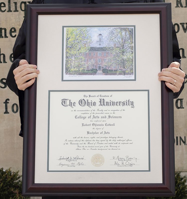 Looking for a diploma frame with a little more OHIO flair? The Bobcat Store offers premier diploma frames that display both a graduate’s degree and an iconic image from the University’s Athens Campus. Choose from a Cutler Hall pen-and-ink drawing, a Cutler Hall watercolor painting, a Cutler Hall photograph, an aerial photograph of South Green or a photograph of OHIO’s Class Gateway. The premier diploma frames are available for bachelor’s and master’s diplomas.