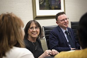 Chris Siegfried, the niece of Isabel Courtney Hall, and College of Fine Arts Dean Matthew Shaftel speak with the first two awardees of the Isabel Courtney Hall Music Education Scholarship and others gathered at a recent luncheon connecting the scholarship’s donors and recipients. Photo by Ellee Achten, BSJ ’14, MA ’17