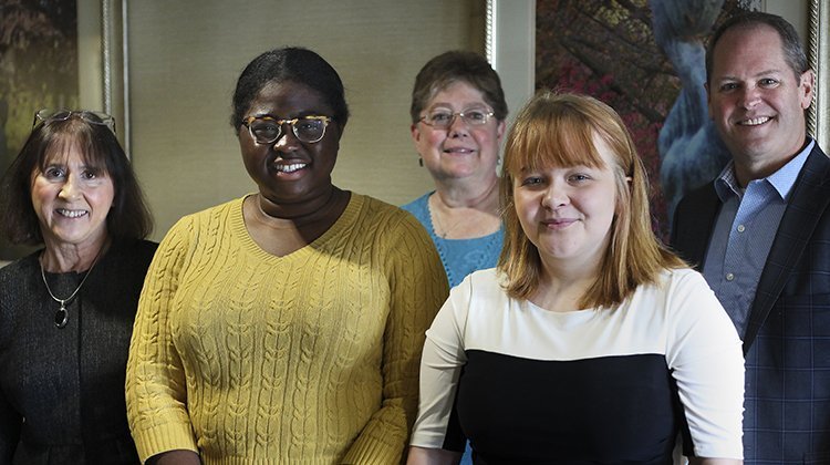 Family and friends of Isabel Courtney Hall, BFA ’46, BSED ’47, recently met with the first two recipients of the Isabel Courtney Hall Music Education Scholarship. Pictured (from left) are Chris Siegfried, Hall’s niece; Mietta Smith, a first-year OHIO student majoring in music education; Teresa Beach, Hall’s niece; Heather Aycock, a first-year student studying music education; and Tim Rogers from the Charles and Isabel Hall Foundation. Photo by Ellee Achten, BSJ ’14, MA ’17