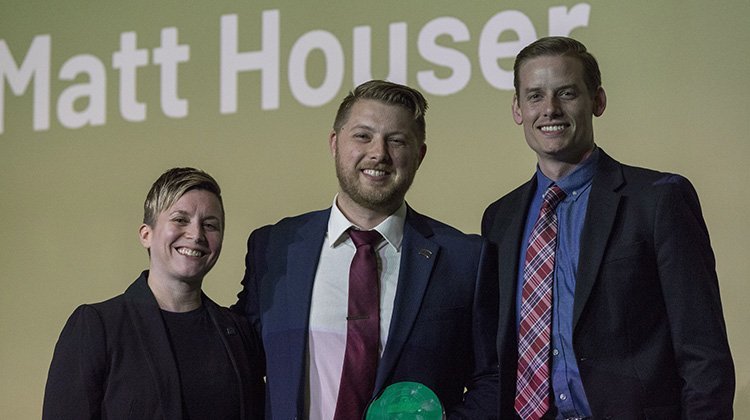 Erin Essak Kopp, assistant vice president for alumni relations and executive director of the OHIO Alumni Association, and Ryan Boyd, assistant director of external relations for the Alumni Association, pose for a photo with Ohio University’s 2019 Konneker Volunteer of the Year, Matt Houser, BSC ’08, president of the Middle Tennessee Alumni Chapter. Photo by Max Catalano, BSVC ’20