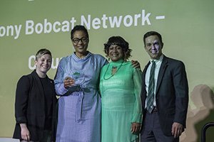 Tonya Mitchell, BBA’91, and Lori Peterson, BSJ’87, accept the Alden Community Service Award on behalf of the Ebony Bobcat Network’s Columbus affiliate. They are pictured with Erin Essak Kopp, assistant vice president for alumni relations and executive director of the OHIO Alumni Association, and Kyle Triplett, BA ’12, MBA ’17, chair of the Alumni Association Board of Directors’ Awards Committee. Photo by Max Catalano, BSVC ’20