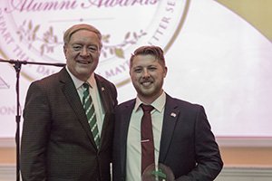Ohio University President M. Duane Nellis congratulates Matt Houser, BSC ’08, who was presented the Konneker Volunteer of the Year Award at this year’s Celebration of Volunteerism. Photo by Max Catalano, BSVC ’20