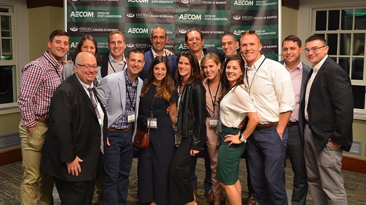 Alumni from the Master of Sports Administration Class of 2009, including Matt Kittle (back row, second from right), gather for a group photo during this year’s OHIO Sports Administration Symposium, held May 9-11 on the Athens Campus. Photo by Quintin Lash