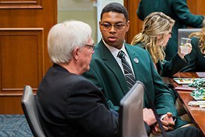 Russ College of Engineering and Technology Dean Dennis Irwin interacts with one of the College’s Karol A. and Jo Ondick Engineering Ambassadors. Photo courtesy of the Russ College of Engineering and Technology
