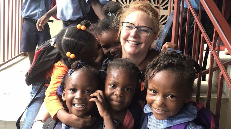 Audiologist Vanessa Lee, MAHSS ’95, is pictured with just a few of the hundreds of Haitian schoolchildren she has provided hearing screenings to during three trips to the Caribbean nation. Photo courtesy of Vanessa Lee