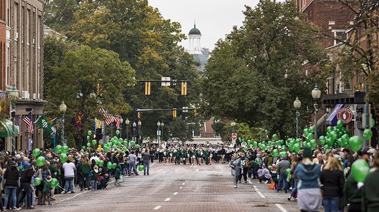 Court Street is lined with green balloons and Bobcat spirit as OHIO’s Marching 110 makes its way along the bricks of Athens during the 2018 Homecoming Parade. Photo by Max Catalano, BSVC ’20