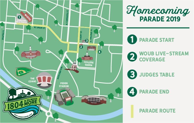 The parade will end at Ohio University’s Templeton-Blackburn Alumni Memorial Auditorium. Judging of floats and banners will occur on the patio of OHIO’s Schoonover Center for Communication at Union and College Streets.