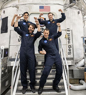 Bob Ferguson, BSME ’98, and his three NASA HERA XX crewmates celebrate at NASA’s Johnson Space Center after emerging from the mock spacecraft they were confined to during the research expedition. Photo courtesy of Bob Ferguson
