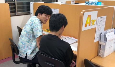 From left, Koudai Nakada with a student at School IE at Urasoe Maeda, Okinawa.