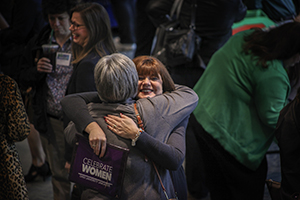 Molly Bates embraces a friend during registration at the 2019 Celebrate Women conference. This year’s conference will be held on March 27 at Ohio University Lancaster. Photo by Ellee Achten, BSJ ’14, MA ’17