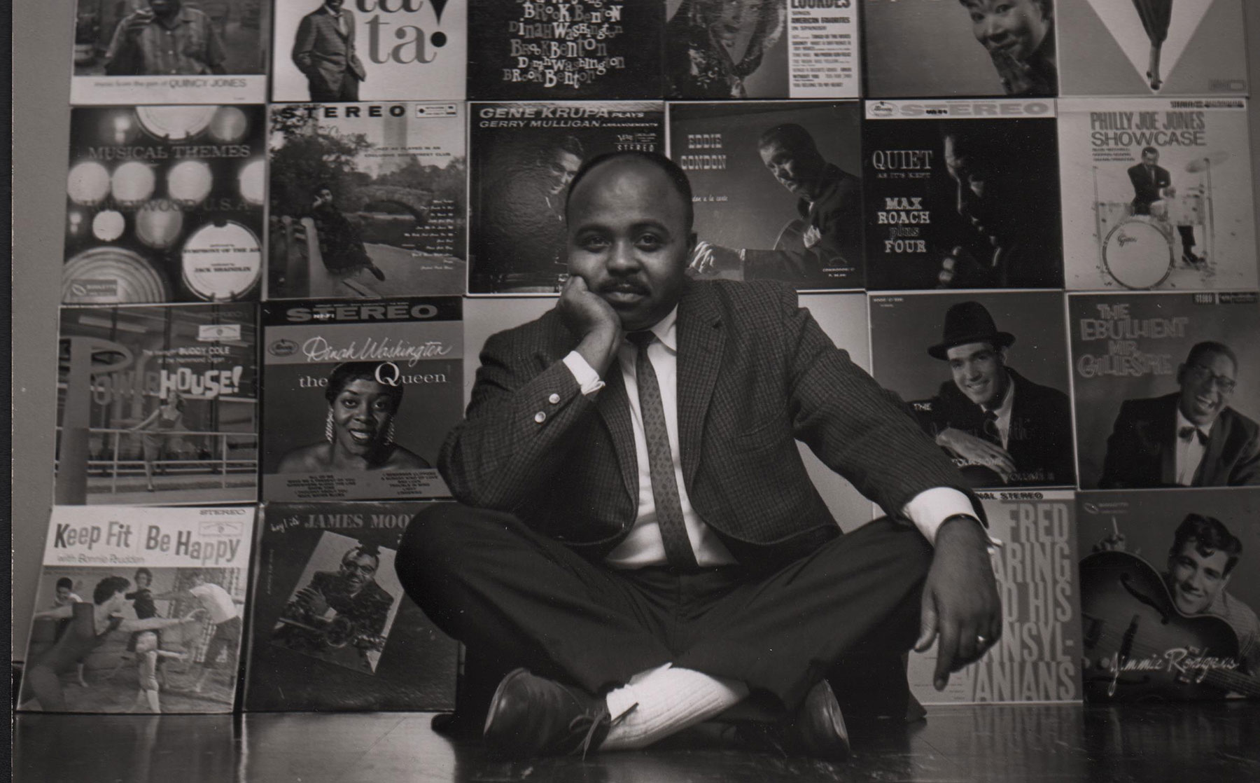 Top image: Chuck Stewart, BFA ’49, is pictured in front of some of the thousands of album covers that feature his photography.