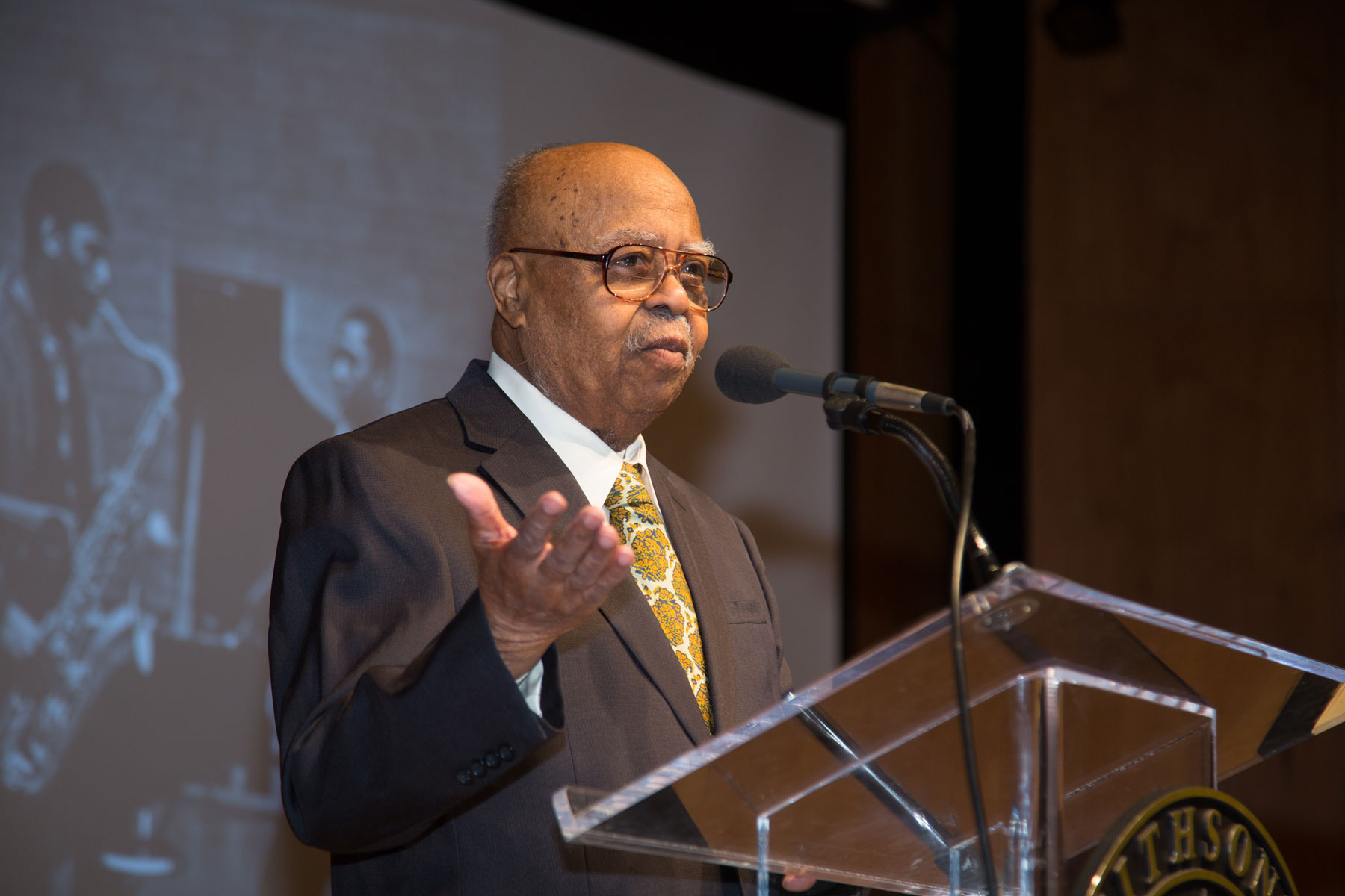 Chuck Stewart, BFA ’49, speaks at the Smithsonian’s Warner Theater at a 2014 event celebrating the 50th anniversary of John Coltrane’s recording of “A Love Supreme,” which Stewart captured in photos. Photo by Jeff Malet