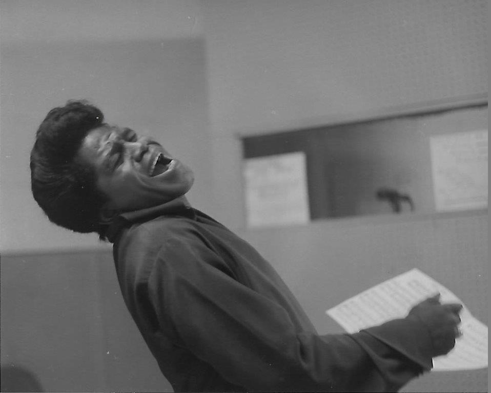 Chuck Stewart, BFA ’49, captured this image of James Brown during a 1966 recording session in New York City. © Chuck Stewart Photography, LLC/Fireball Entertainment Group