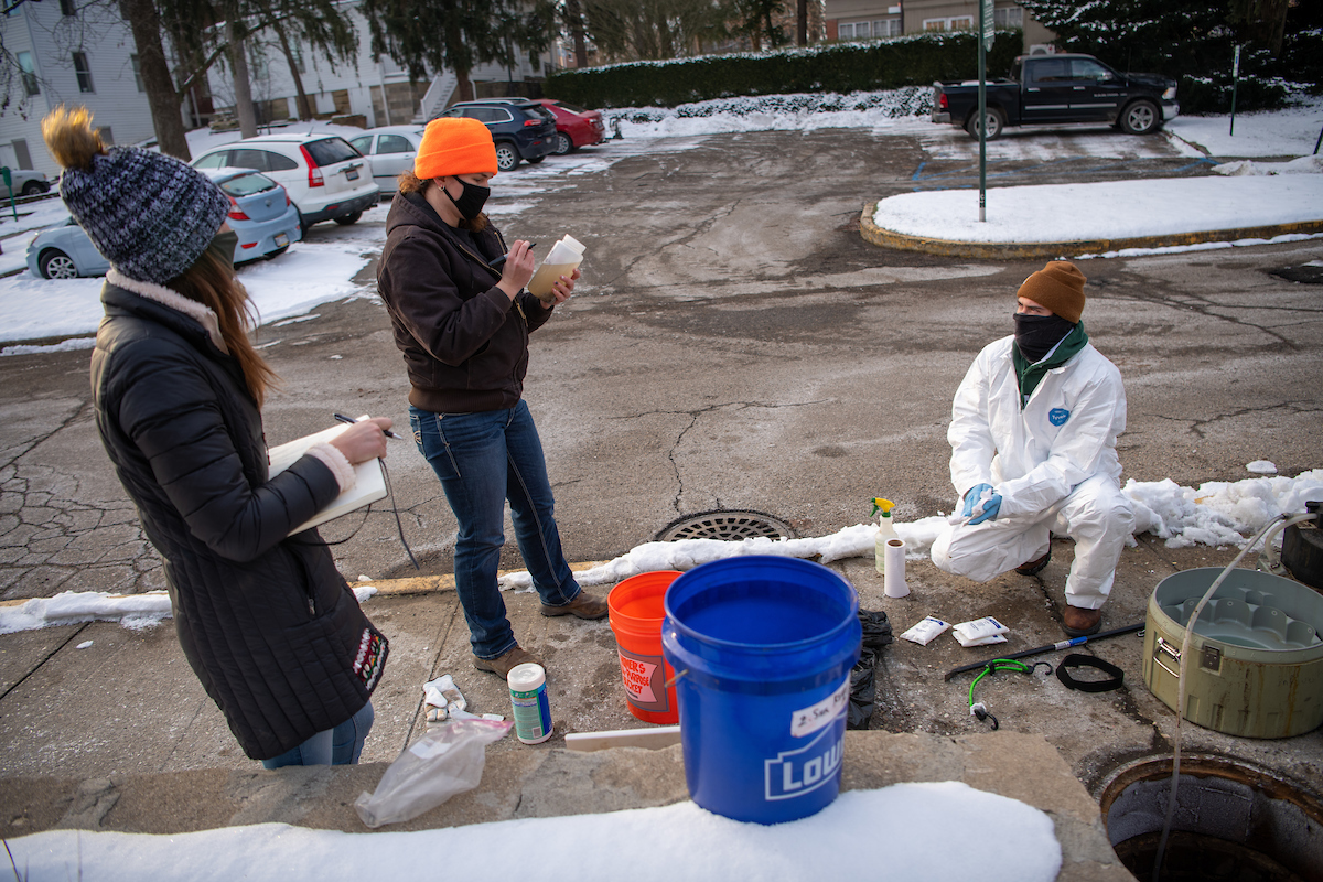 Riefler’s team places wastewater collection bottles at five manhole locations across OHIO’s campus on Sundays and Wednesdays. They use a machine called an autosampler that hangs into the manhole and automatically collects water every hour for 24 hours, compiling the samples into a single bottle. After 24 hours, Riefler and his students take the bottles to Coschigano for analysis.