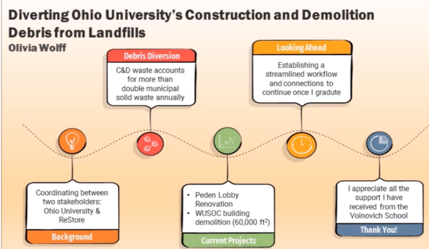 Olivia Wolff, Master of Science in Environmental Studies candidate, won first prize for the Sustainability Award and the Community Engagement Award for her presentation “Diverting Ohio University’s Construction and Demolition Debris from Landfills.” Her presentation focused on diverting Ohio University construction and demolition debris from Ohio landfills through material donations to ReStore. ReStore, part of Habitat for Humanity, is a second-hand home improvement store that accepts material donations and sells them at a lower cost. The goal of Wolff’s project is to raise awareness of ReStore, explore incentives to promote donations from project and contract managers at Ohio University and create a pilot program to organize regular donations across the Athens campus.