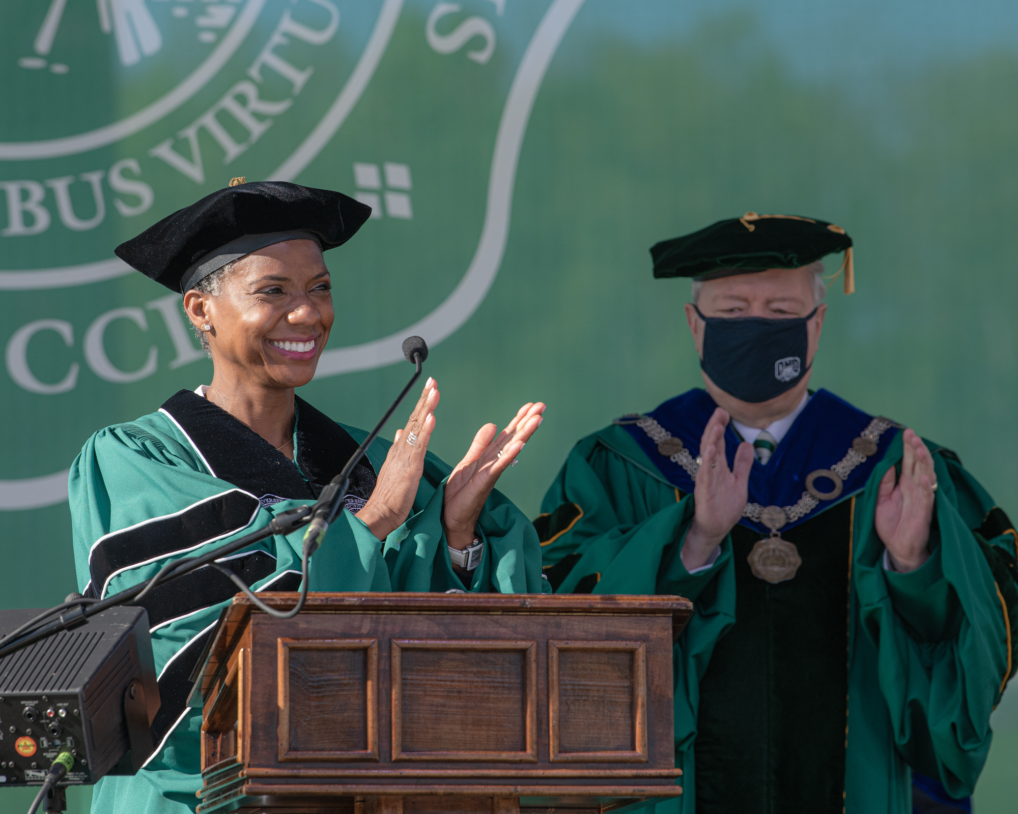Ohio University Board of Trustees Chair Janelle Coleman gives graduates a round of applause at spring commencement.