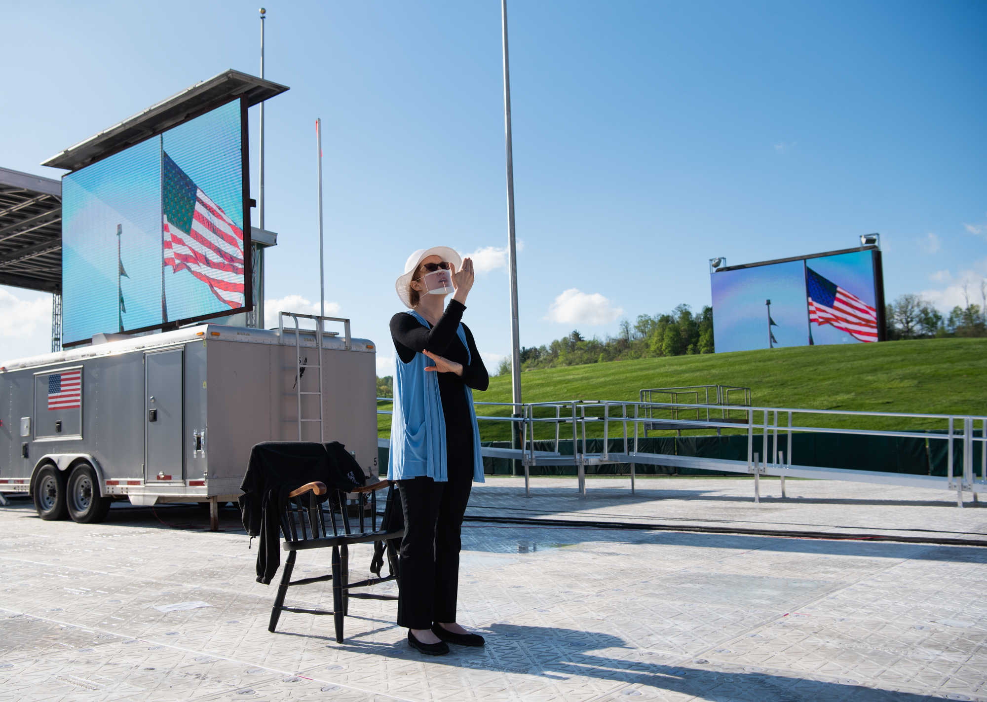 Sign language interpreter Tina Jones interprets the national anthem the start of the Graduate Commencement Ceremony on Friday, April 30, 2021.