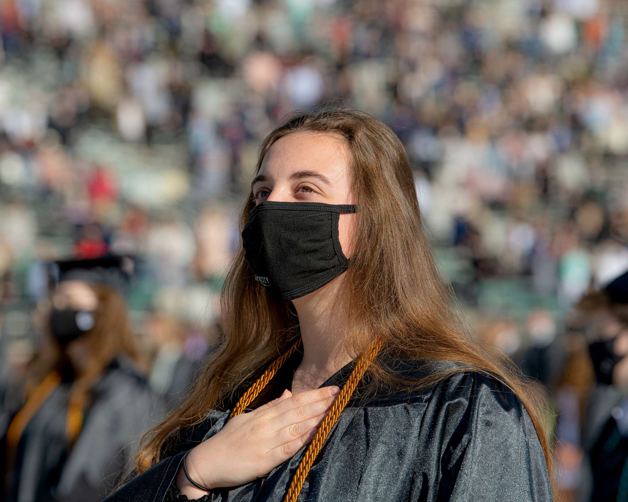An undergraduate student places her hand on her heart during the pledge of allegiance at spring commencement.