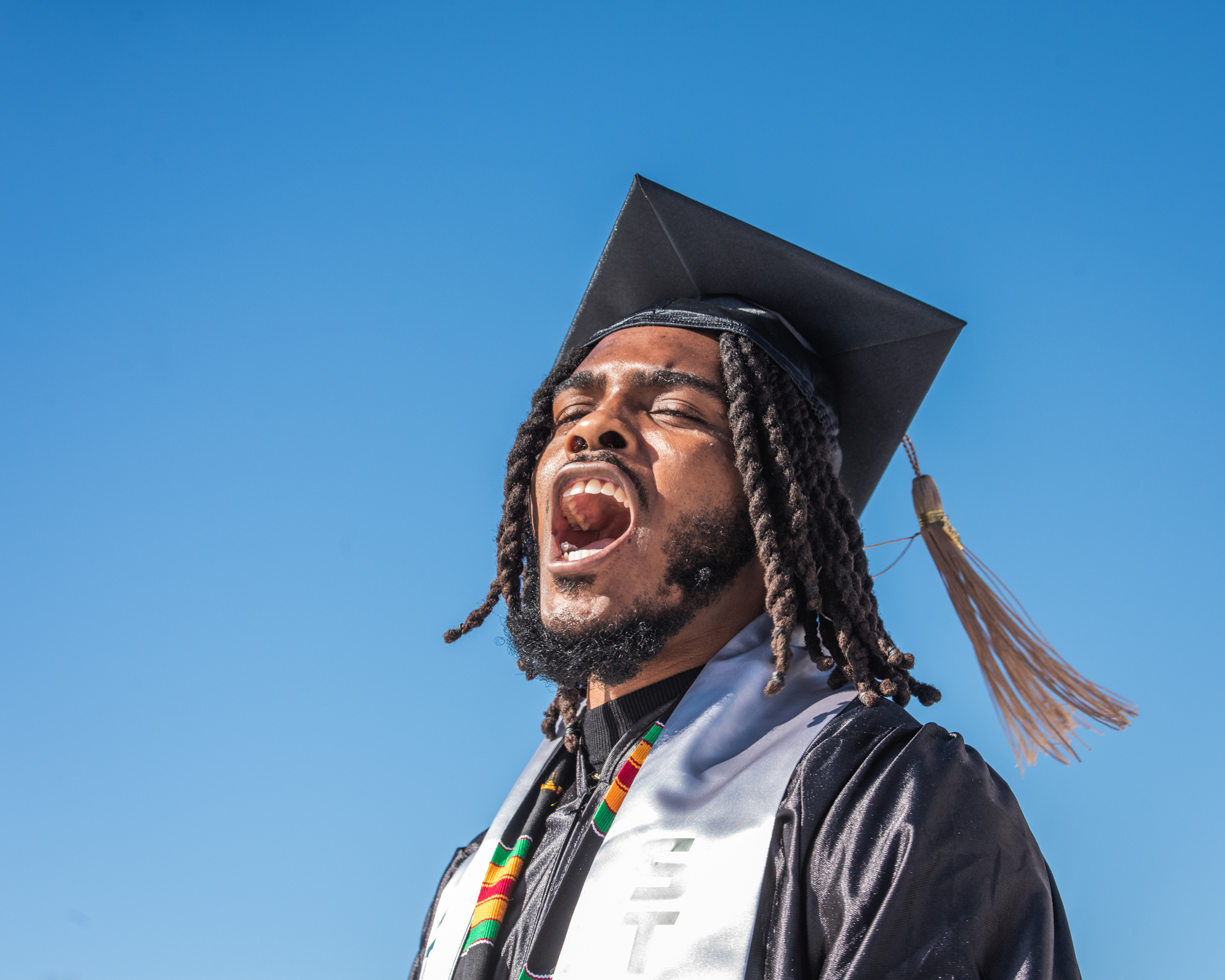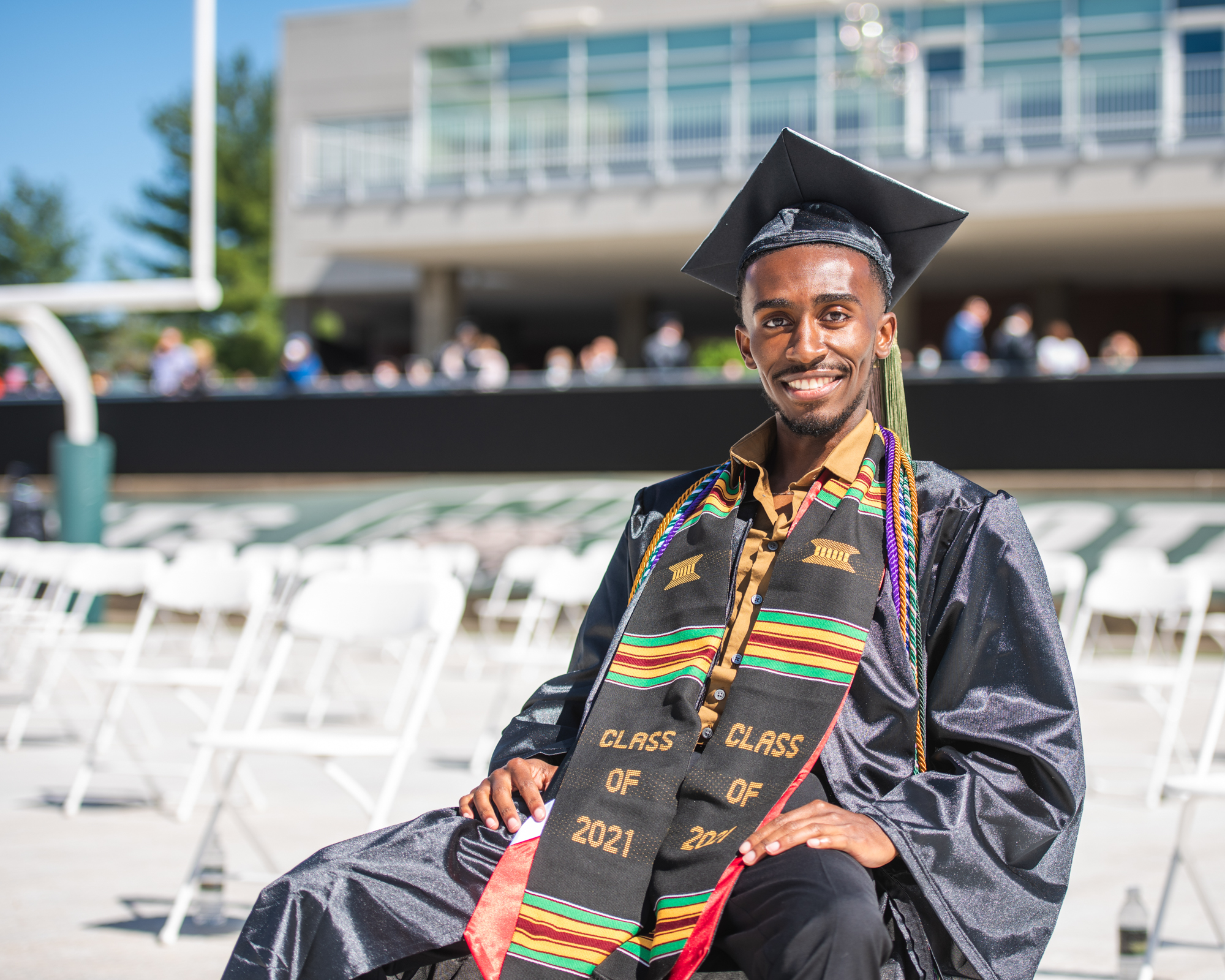 KJ Russell waits for undergraduate commencement to begin.