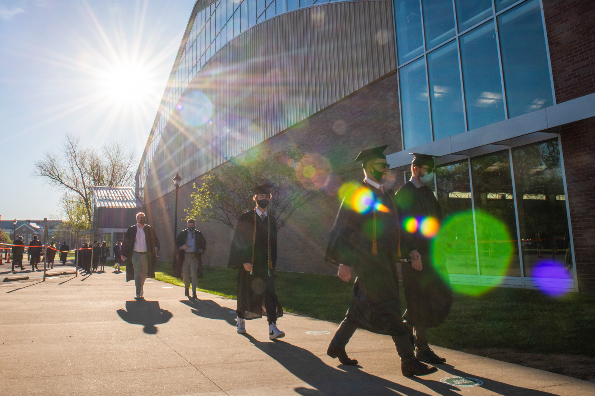 Undergraduate students arrive at commencement at the Walter Fieldhouse.
