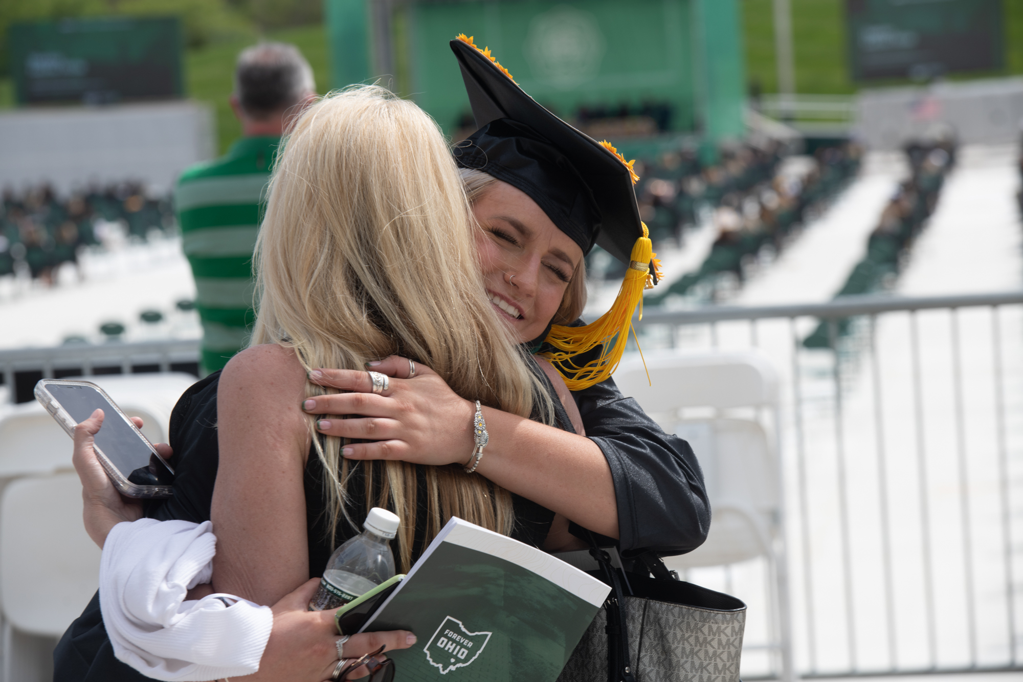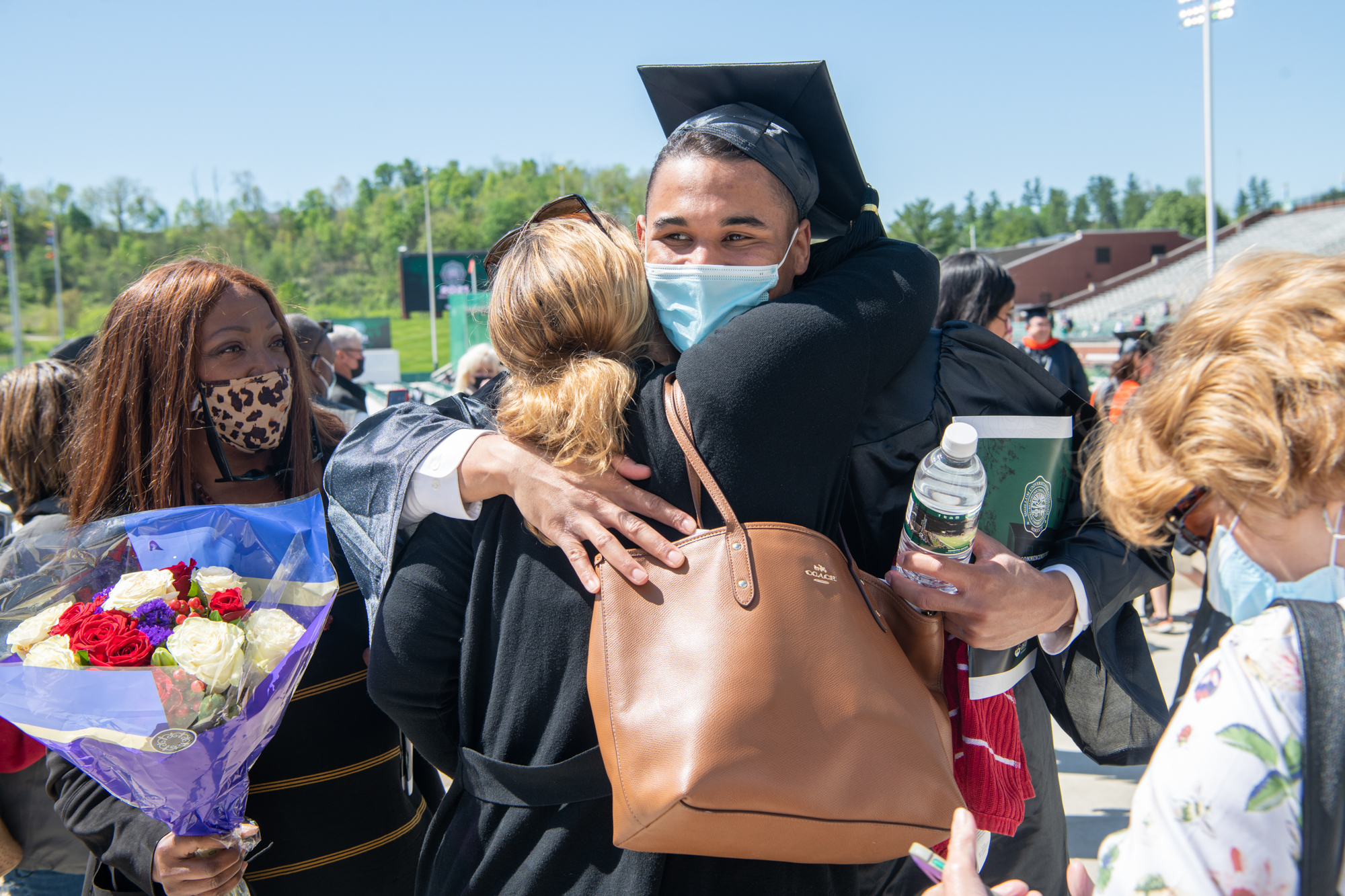 Peyton Cantrell hugs family following spring commencement at Ohio University on Sunday.
