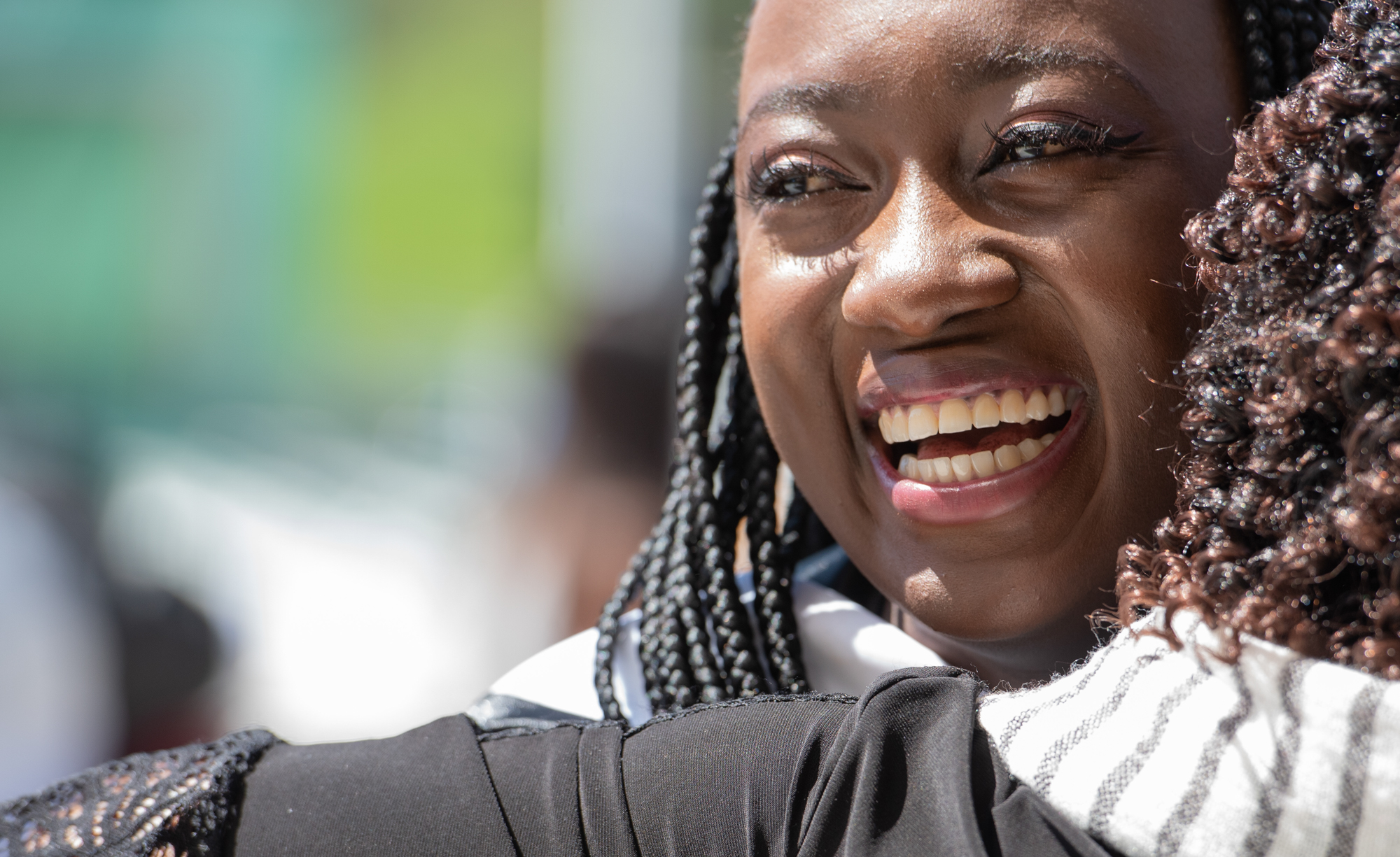 A new graduate hugs a supporter at spring commencement.
