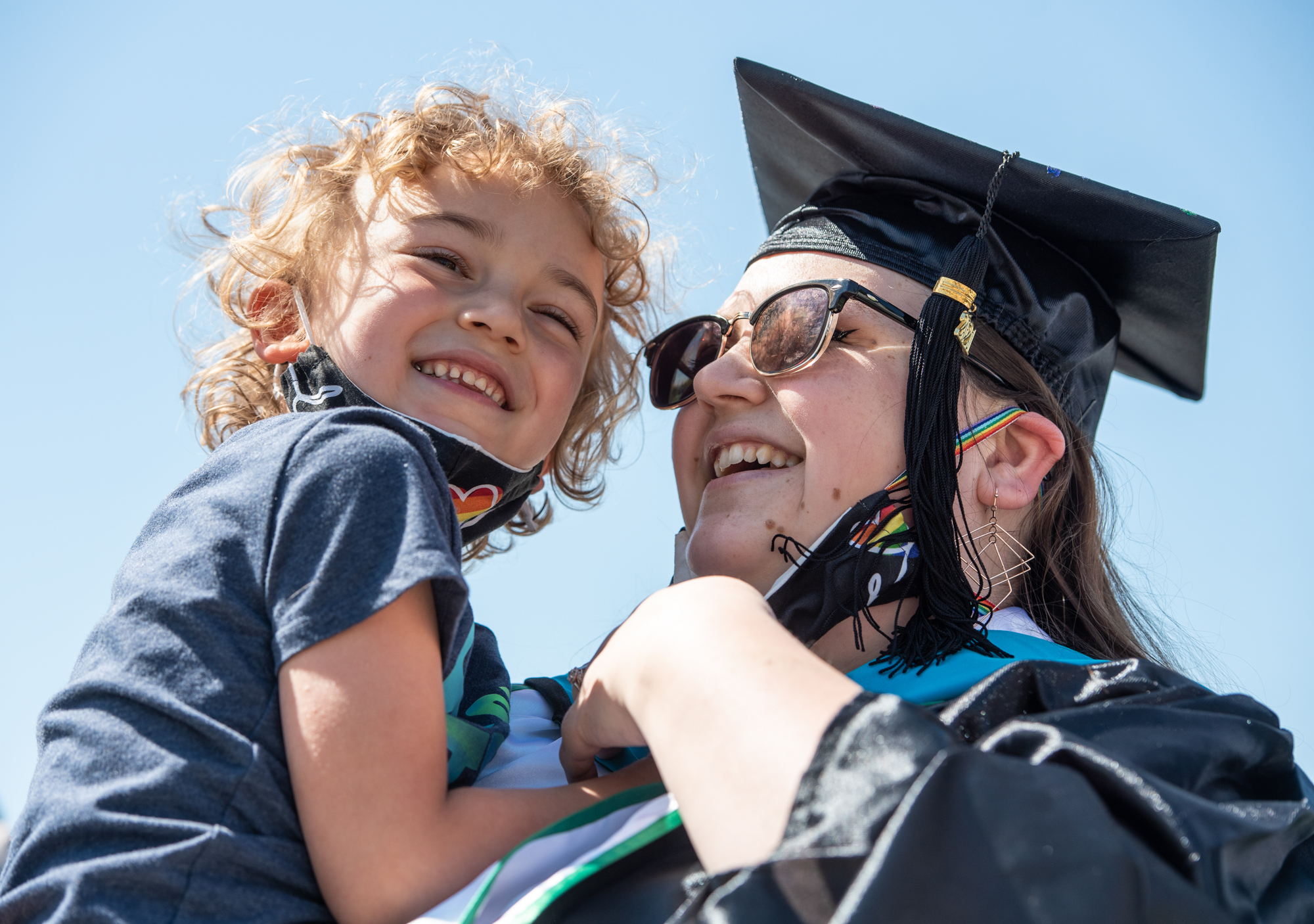 Catherine Russell holds Joey Russell as they celebrate after the Graduate Commencement Ceremony on Friday, April 30, 2021.