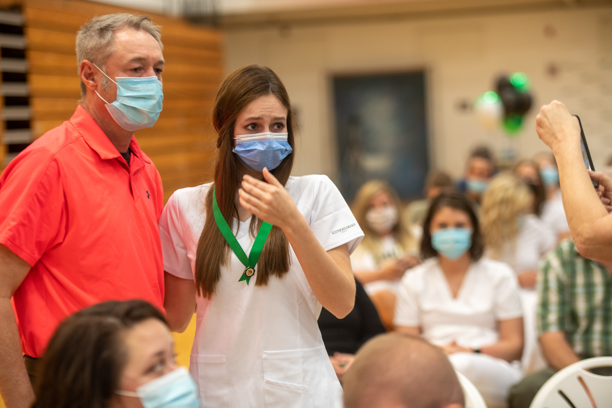 Nursing graduate Leslie Kaltenbach tears up after her dad Brian Kaltenbach congratulates her at the Ohio University Chillicothe Recognition Ceremony for Nursing Graduates.