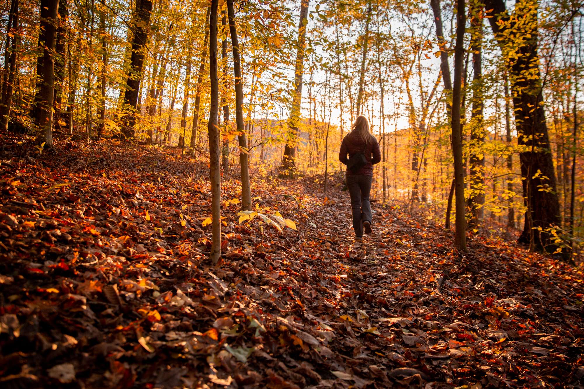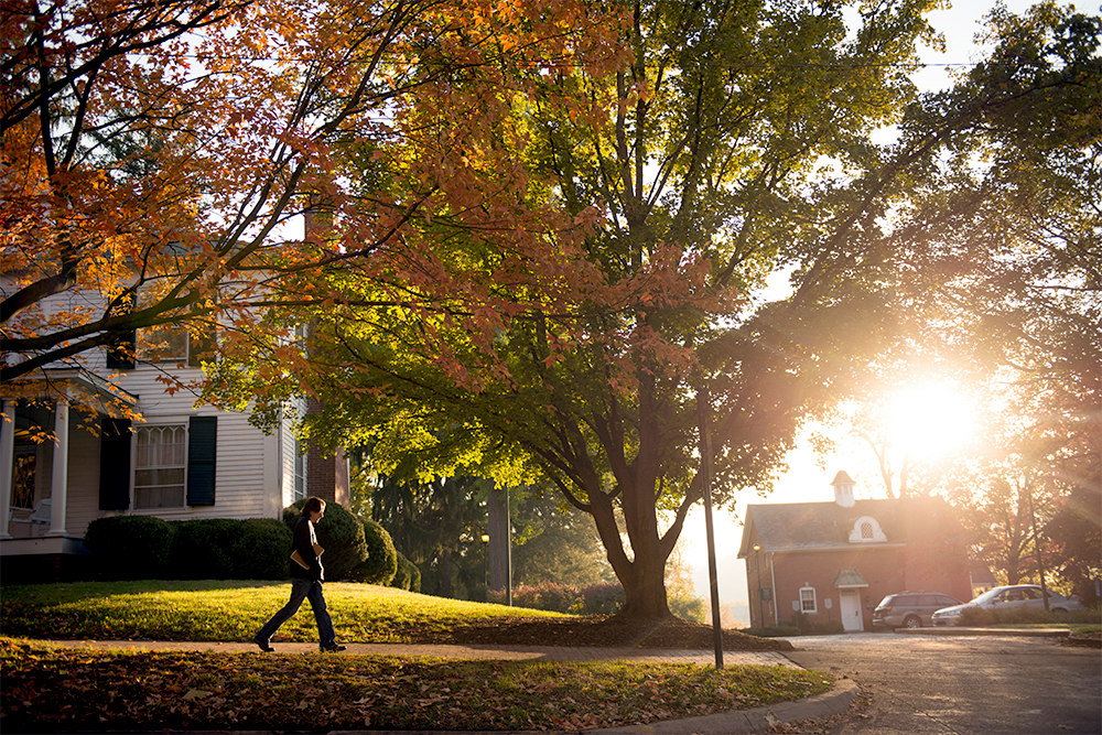 A pedestrian enjoys the fall colors at sunset in front of Claire Ping Cottage on the campus of Ohio University.