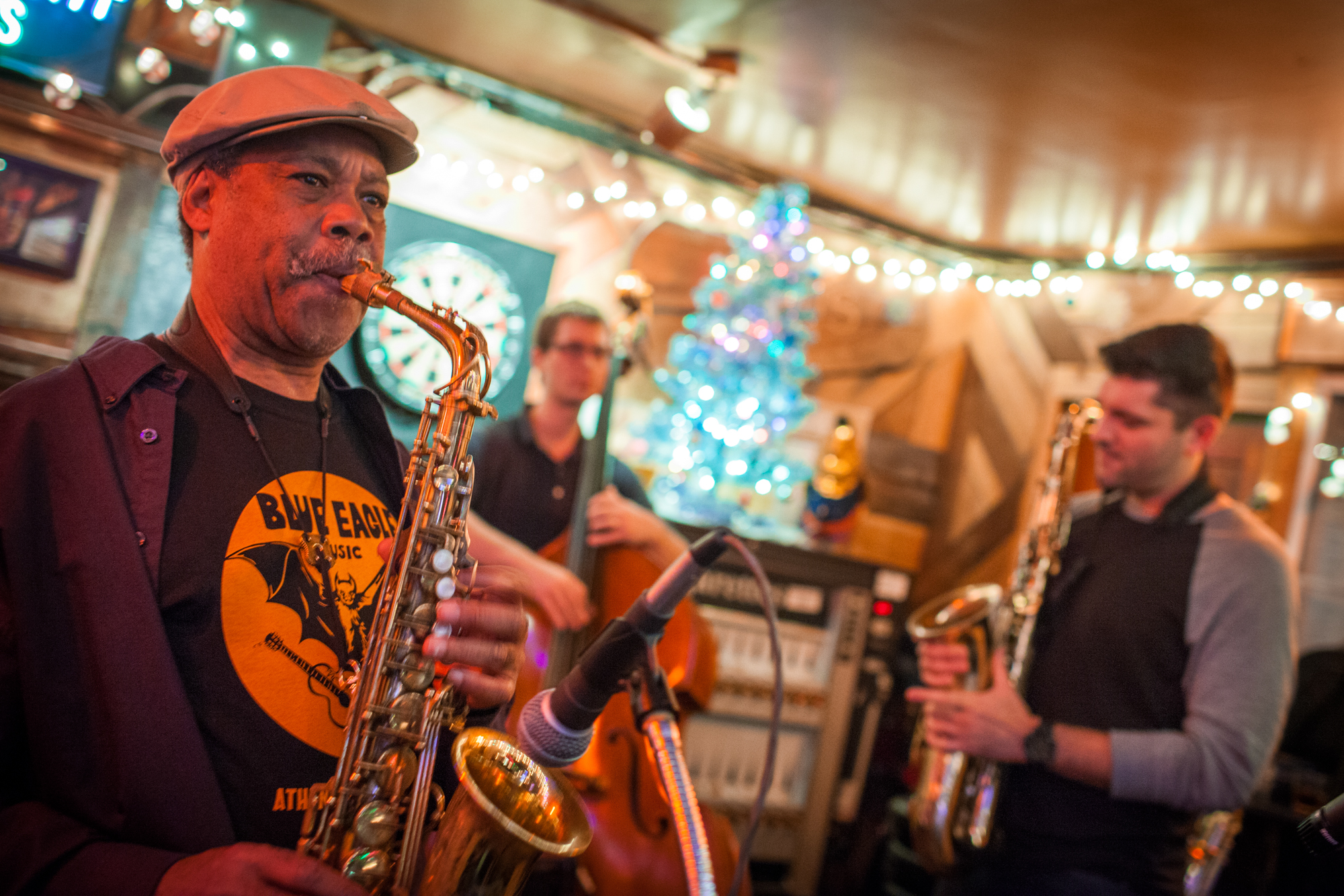 Photograph of the Word of Mouth band playing at Tony's Tavern on Dec. 15, 2015. They play every Tuesday night which is now being called "Jazz Night" by locals.